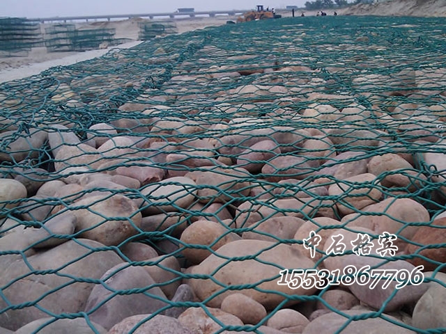 護腳固濱石籠中裝入塊石,塊石較大而平的一面擺在籠子周圍,使固濱石籠四周平直。避免出現(xiàn)凸凹現(xiàn)象。中間用顆料較小的石塊填塞緊密,固濱石籠四周石料不能小于網(wǎng)孔尺寸。固濱石籠較上一層石塊擺放時,應(yīng)大面朝上。保證固濱石籠的平整,較后封閉格賓石籠。固濱石籠之間用綁扎線進行連接,形成一個更穩(wěn)固的整體。